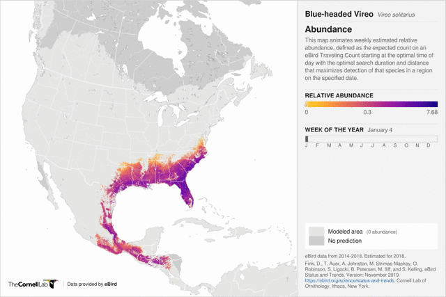 Here we have a map of the abundance of the blue-headed vireo throughout the year—which also serves as a sort of migration map for the lil muffin. As you can see they winter in the south and summer in the north, like a lot of migrating birds. What that means for us is that if you’re in East Texas in August and you think you see a blue-headed vireo, it’s worth a double check. Now, it’s not impossible, but it is unlikely.